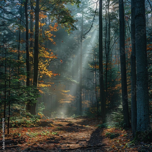 © Оля Ангельчева, Naklejka premium Autumn foggy forest with light rays
