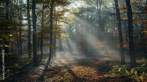 © Оля Ангельчева, Fototapeta premium Autumn foggy forest with light rays