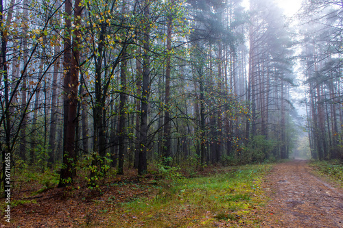 © sergofan2015, Obraz premium Autumn foggy pines forest on the morning.