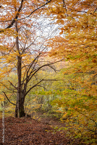 Fototapeta premium Autumn foliage in a tranquil forest with colorful leaves and a peaceful...