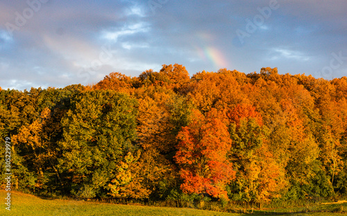 © vermontalm, Fototapeta premium autumn foliage in early morning with rainbow peeking through clouds