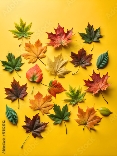 Fototapeta premium Autumn Foliage in Red, Blue, Yellow Tones, Nature Inspired Design, Artistic...