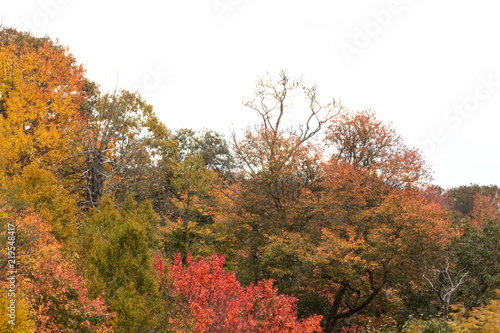© Natalie Schorr, Fototapeta premium Autumn foliage mixed trees with mountains in the distance, horizontal aspect
