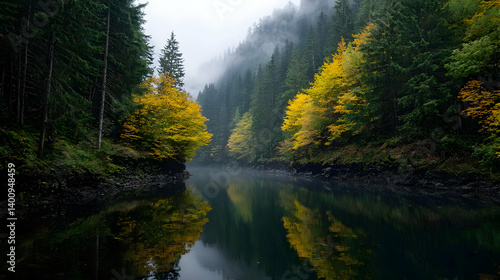 © Parsudi, Fototapeta premium Autumn Foliage Reflecting In Calm River