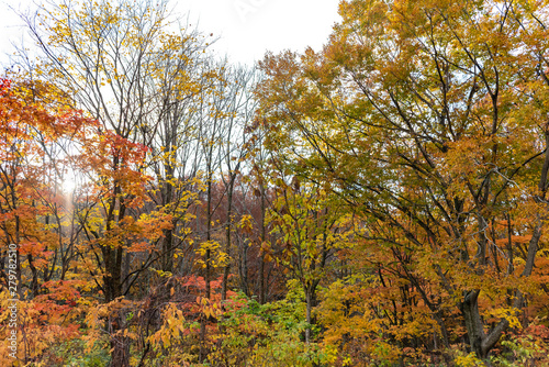 © Shawn.ccf, Fototapeta premium Autumn foliage scenery view, beautiful landscapes. Colorful forest trees in the foreground, and sky in the background