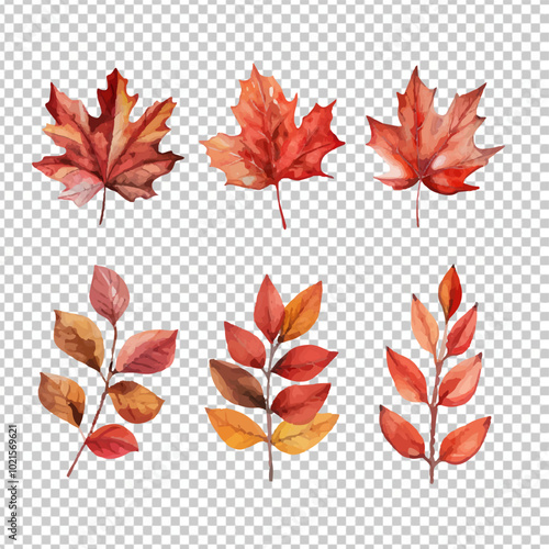 © Nataliia, Obraz premium Autumn foliage watercolor collection set, fall leaves, maple leaf. Forest design elements illustration isolated on transparent background