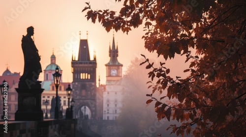 Fototapeta premium Autumn foliage with beautiful historical buildings of Prague city in Czech...