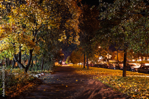 © Nelli, Naklejka premium Autumn footpath in the night city photographed by the light of street lights and lanterns