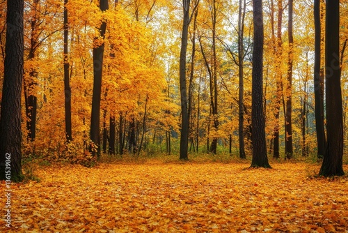 © Tengkwa, Obraz premium Autumn Forest: A breathtaking panorama of a forest ablaze with the vibrant colors of autumn, a symphony of golden leaves and towering trees, capturing the serene beauty of nature's transition.