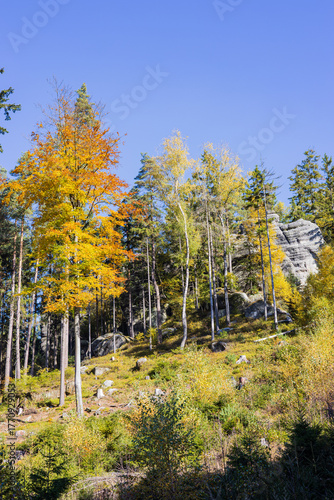 Fototapeta premium Autumn forest and rocks under a blue sky on a sunny day. Cat Rocks, Czech...