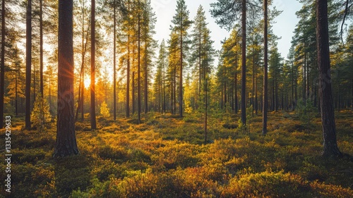 © Yopi, Fototapeta premium Autumn Forest at Sunset: Golden Sunlight Through Pine Trees