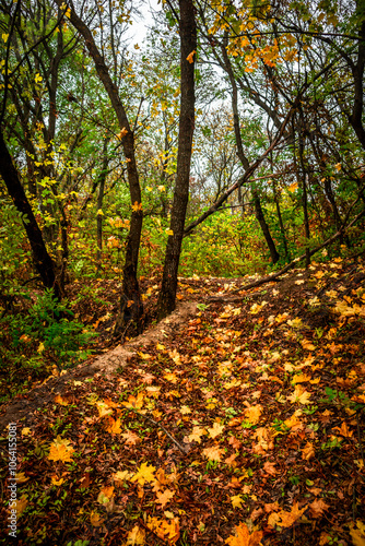 © Aleksandr Riabinin, Obraz premium Autumn forest at the morning,green and yellow leaves on trees.Beautiful landscape pictures in the woodlands and forest.Path in the woods, Ukrainian nature.Beautiful and mystery weather ,fall colors