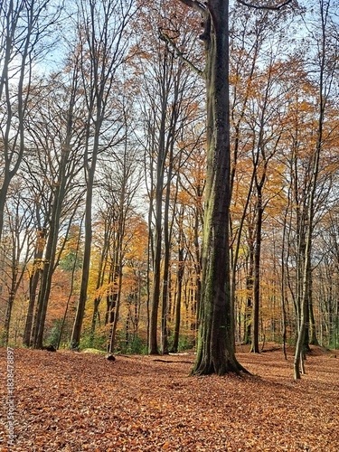 © Nadiia., Fototapeta premium Autumn forest background with fallen brown and orange leaves on the ground. Autumn forest nature. Trees in the forest..