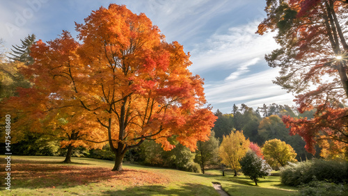 © vector db, Naklejka premium Autumn Forest Background with Falling Leaves and Warm Sunset Light