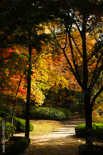 © jimmy C., Fototapeta premium Autumn forest. Colorful forest with sun rays through branches of trees. Scenery of nature with sunlight.