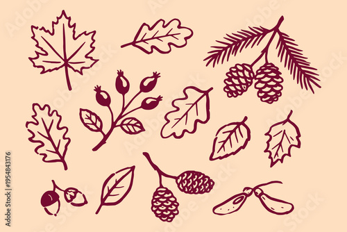 © Victoria, Obraz premium Autumn forest elements set outline sketch vector illustration