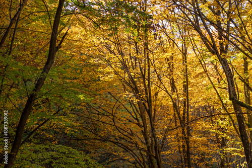 Fototapeta premium Autumn forest foliage vibrant golden leaves illuminate sunlit fall nature