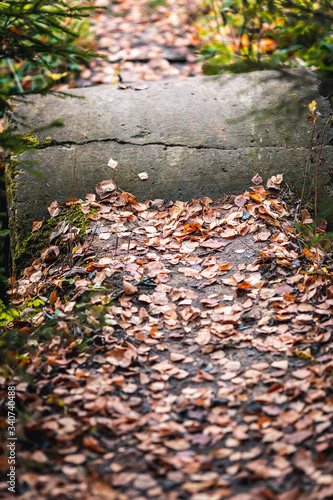 © Ann, Obraz premium Autumn forest footpath with fallen leaves.
