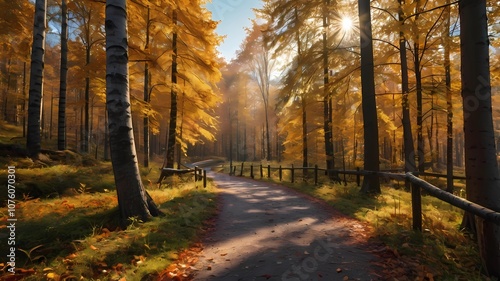 Obraz premium Autumn forest. Forest pathway through the autumn forest. Sunny forest autumn landscape in sunny day. high quality, 8K Ultra Hd