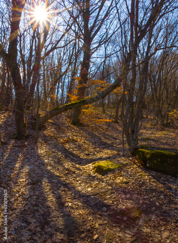 © Yuriy Kulik, Fototapeta premium autumn forest glade in light of sparkle sun