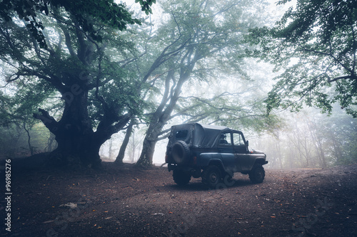 Fototapeta premium Autumn forest in fog. Beautiful natural landscape. Vintage style
