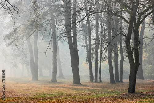 Obraz premium Autumn forest in fog. Sunlight through morning haze and dark silhouettes of...