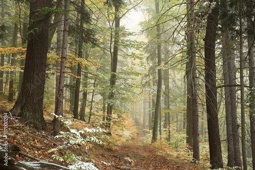 © Aniszewski, Fototapeta premium Autumn forest in the fog after a light snowfall