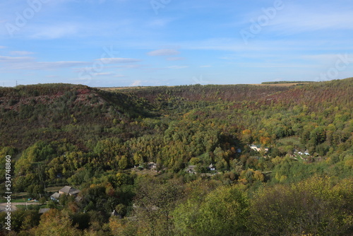 Fototapeta premium Autumn forest in yellow and green. A path in the thicket. The road is strewn...