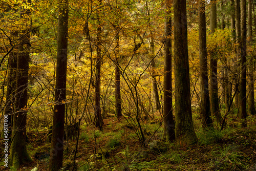 Fototapeta premium Autumn forest landscape. Gold color tree, red and orange foliage in fall...