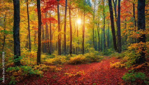 Fototapeta premium Autumn forest landscape, orange golden foliage, fall wallpaper