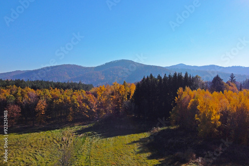 © Dzmitry, Fototapeta premium Autumn Forest Landscape with Mountain View: Scenic Nature Background for Posters and Prints