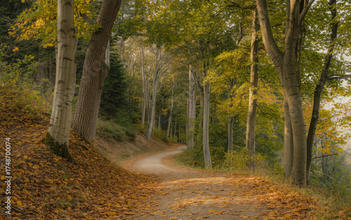© Muhammad, Obraz premium Autumn forest landscape with winding dirt path and colorful fall leaves