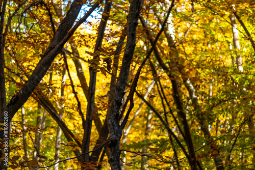 © svetograph, Fototapeta premium Autumn forest leaves, vibrant yellow and orange foliage illuminated by sunlight