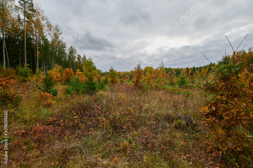 Fototapeta premium Autumn forest nature. Vivid morning in colorful forest