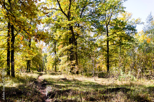 Naklejka premium Autumn forest nature. Vivid morning in colorful forest with sun rays through branches of trees.