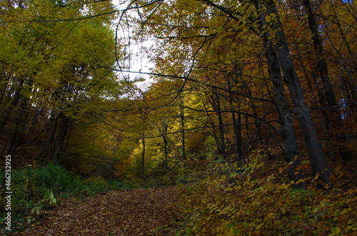 © maria, Obraz premium Autumn forest nature. Vivid morning in colorful forest with sun rays through branches of trees.