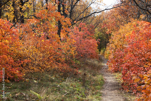 © Elena, Fototapeta premium Autumn forest on sunny September day. Forest path going deep into the forest. Bright red and yellow colors of autumn. Selective focus
