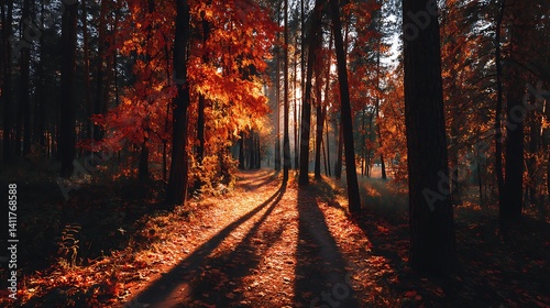© goodskin, Obraz premium Autumn forest path bathed in sunlight