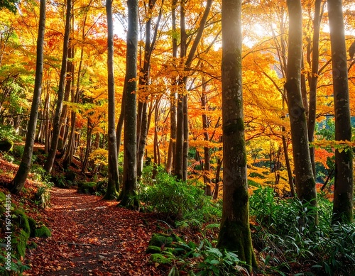 Obraz premium Autumn forest path bathed in sunlight