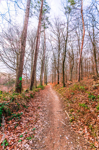 © dimas830, Obraz premium Autumn forest path covered in fallen leaves with tall trees lining the way
