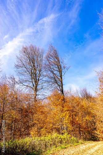 © klenger, Fototapeta premium Autumn Forest Path Covered with Fallen Leaves