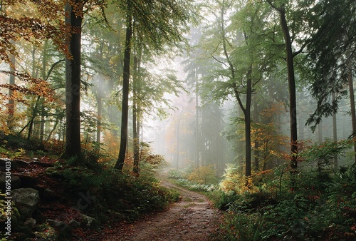 © vikki, Fototapeta premium Autumn Forest Path in Fog: Colorful Vegetation and Natural Charm