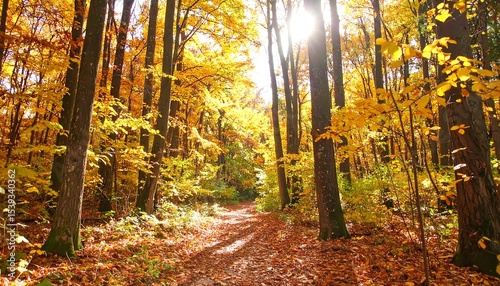 © Aakun, Fototapeta premium Autumn Forest Path Sunlight.