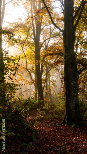© Gandi, Obraz premium Autumn Forest Path, Sunlight, Fog