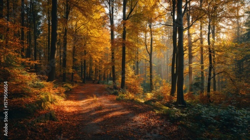 Fototapeta premium Autumn Forest Path Sunlight Golden Leaves