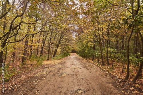 Fototapeta premium Autumn forest path with colorful leaves fallen in the woods