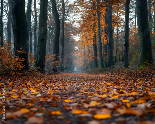 Obraz premium Autumn Forest Path with Fallen Leaves Photo