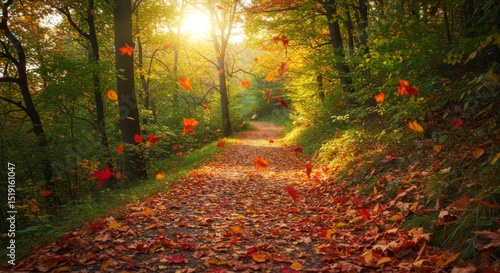 Obraz premium Autumn Forest Path with Falling Leaves and Golden Sunlight