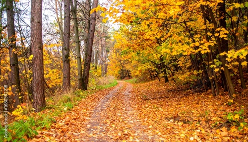 © alex, Fototapeta premium Autumn forest path with falling leaves, seasonal connection