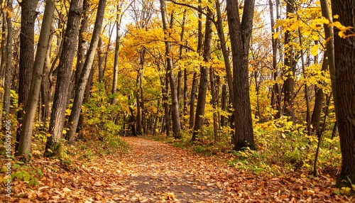 © alex, Fototapeta premium Autumn forest path with falling leaves, seasonal connection